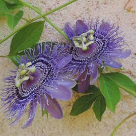 Conocida también como Maracuyá, esta liana trepadora semi-leñosa, además de su interés ornamental, es cultivada por su fruta comestible con pulpa gelatinosa, dulce y de color naranja, muy rica en vitaminas A y C.