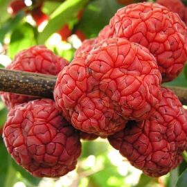 La fruta es grande, de 2,5 cm – 3,5 cm de diámetro, roja o roja-granate, muy atractiva.La carne, roja, es muy jugosa, con un sabor que va desde el melón a la papaya cuando están maduros. Es muy importante que la fruta esté completamente madura para poder disfrutar de todos los «acentos» de su sabor.