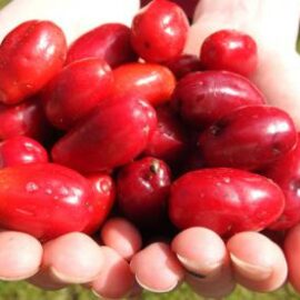 La fruta, roja oscura,casi negra cuando está totalmente madura, mediana-grande (3,5-5,5 gr), es muy dulce, sabrosa, con un 14-16% en azúcares y 2,4% en ácidos. Tiene un contenido medio de 58 mg de Vitamina C, 160 mg de Flavonoides y 195 mg de Iridoides.